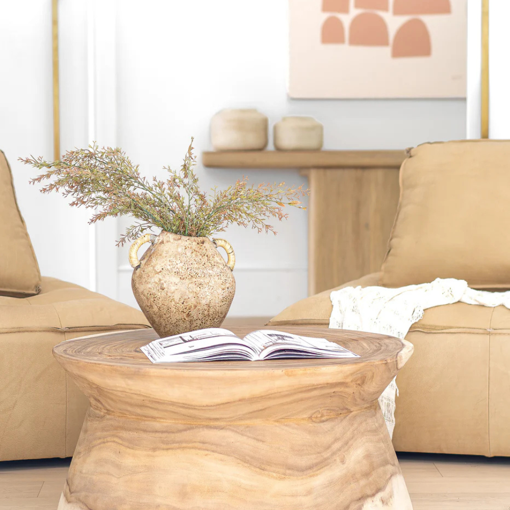 Ideal for displaying dried arrangements, or as a standalone statement piece, the Ghaba Vase complements a variety of interior styles. Its organic shape and natural tones add a touch of elegance to mantels, tabletops, or shelves.