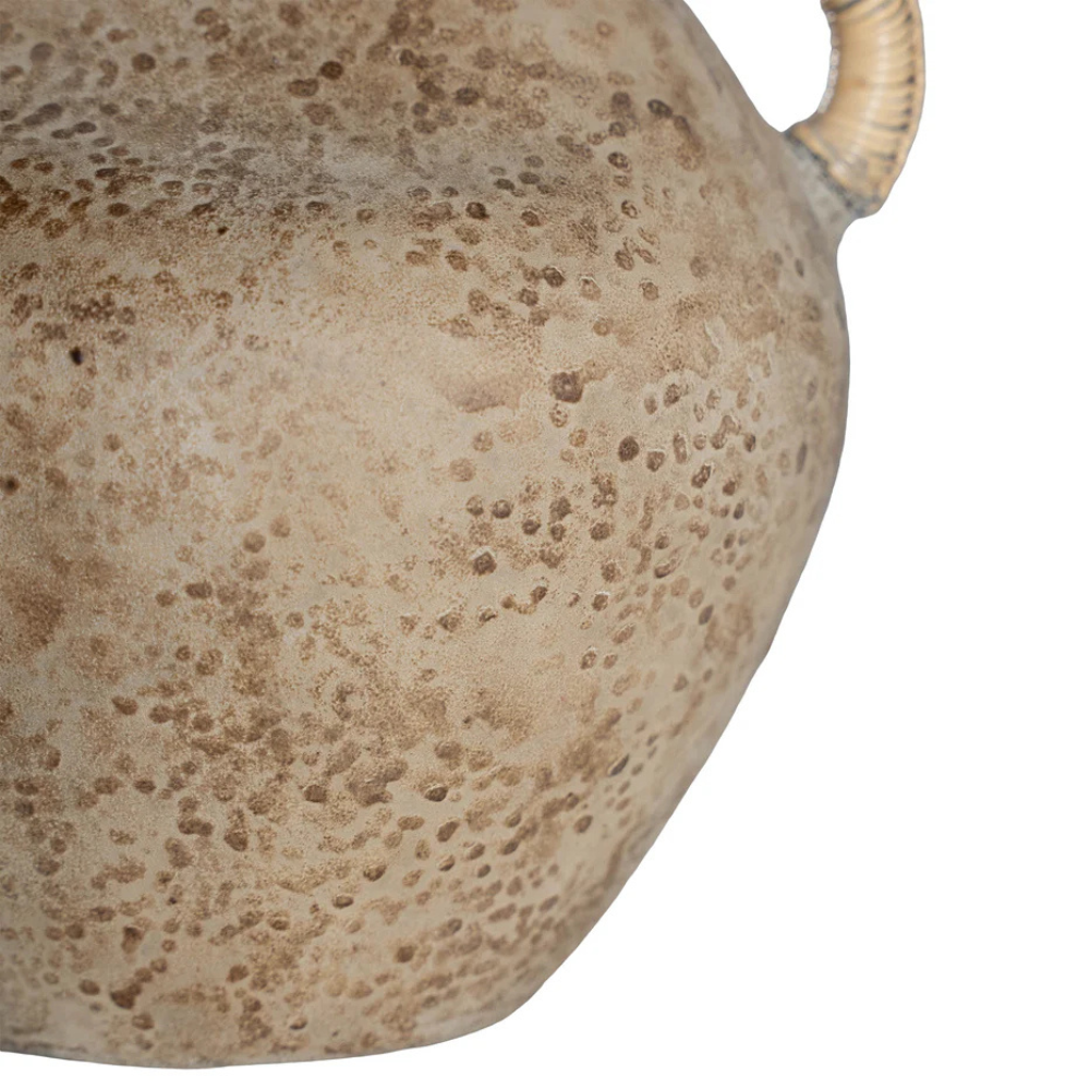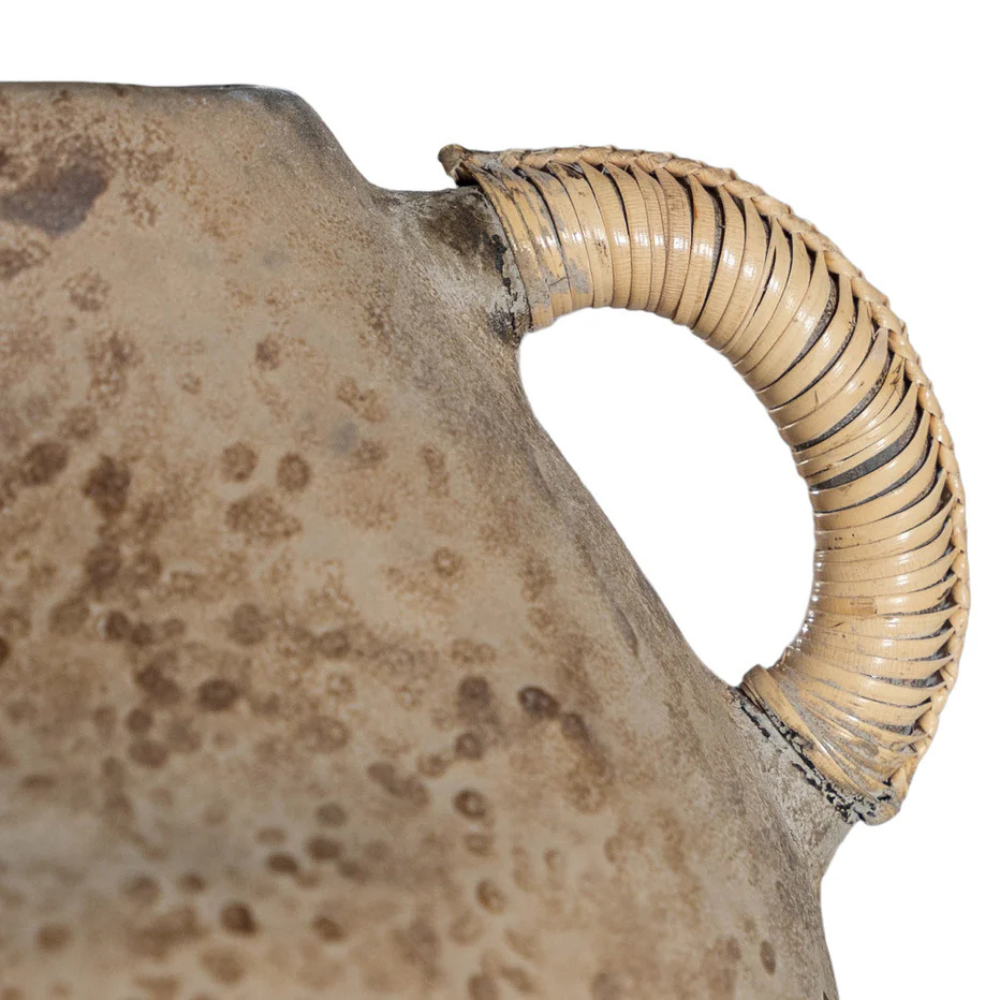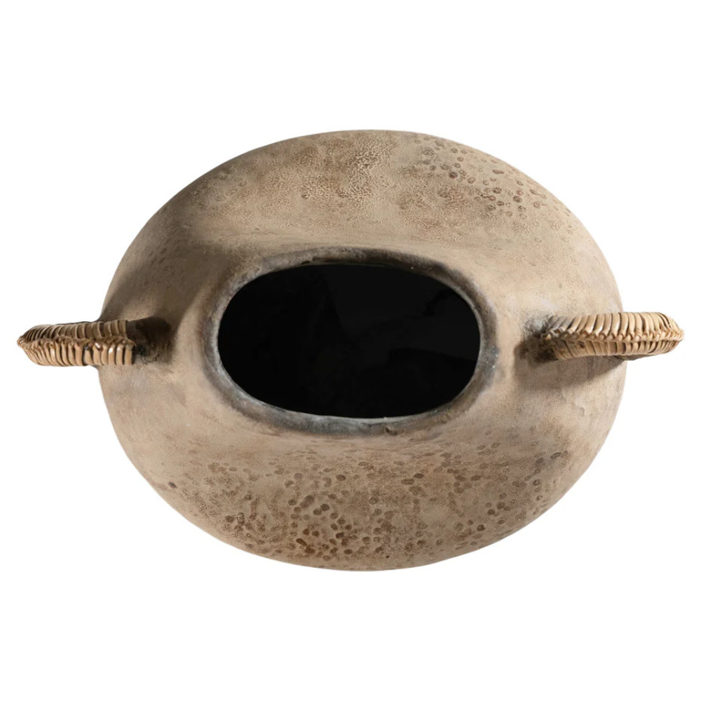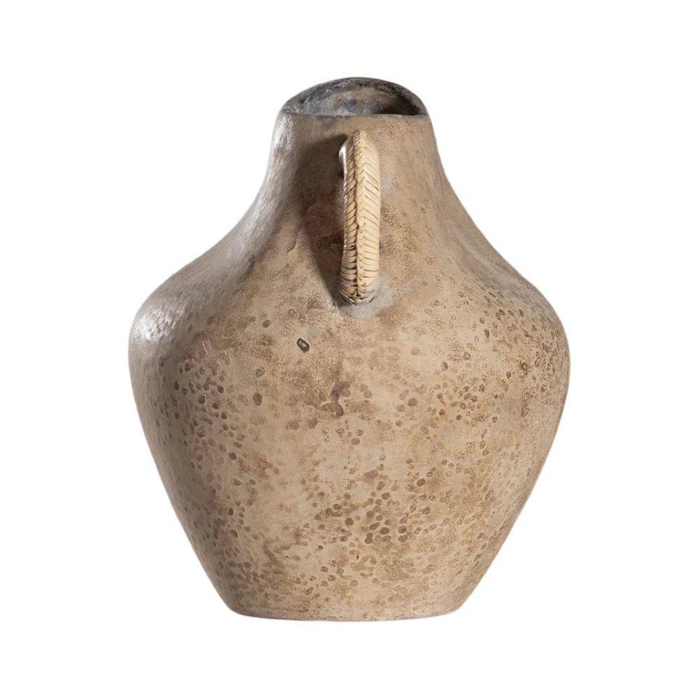 The Ghaba Vase, is a refined piece handcrafted from premium terracotta. This vase features a unique, earthy texture and a rustic design with a softly rounded body and two delicately wrapped handles, making it a sophisticated addition to any high-end interior.