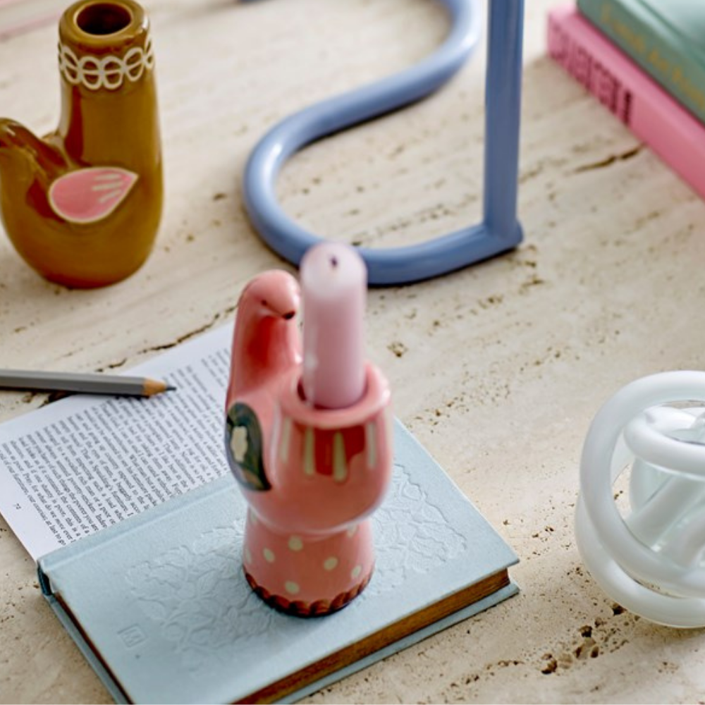 The Trudy Candle Holder is a cozy addition to the home. Made of stoneware, it features a decorative design shaped like a bird. With its beautiful glaze in pink tones, it can easily be paired with other candle holders. Part of the candle holder is hand-painted, so the color may vary.