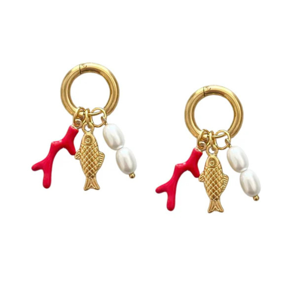 Gorgeous red coral, gold fishy and pearl.