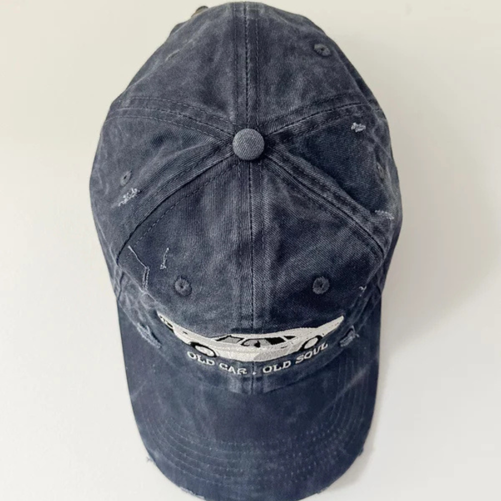 Hand painted car design embroidered on vintage wash navy cap with adjustable brass look strap.