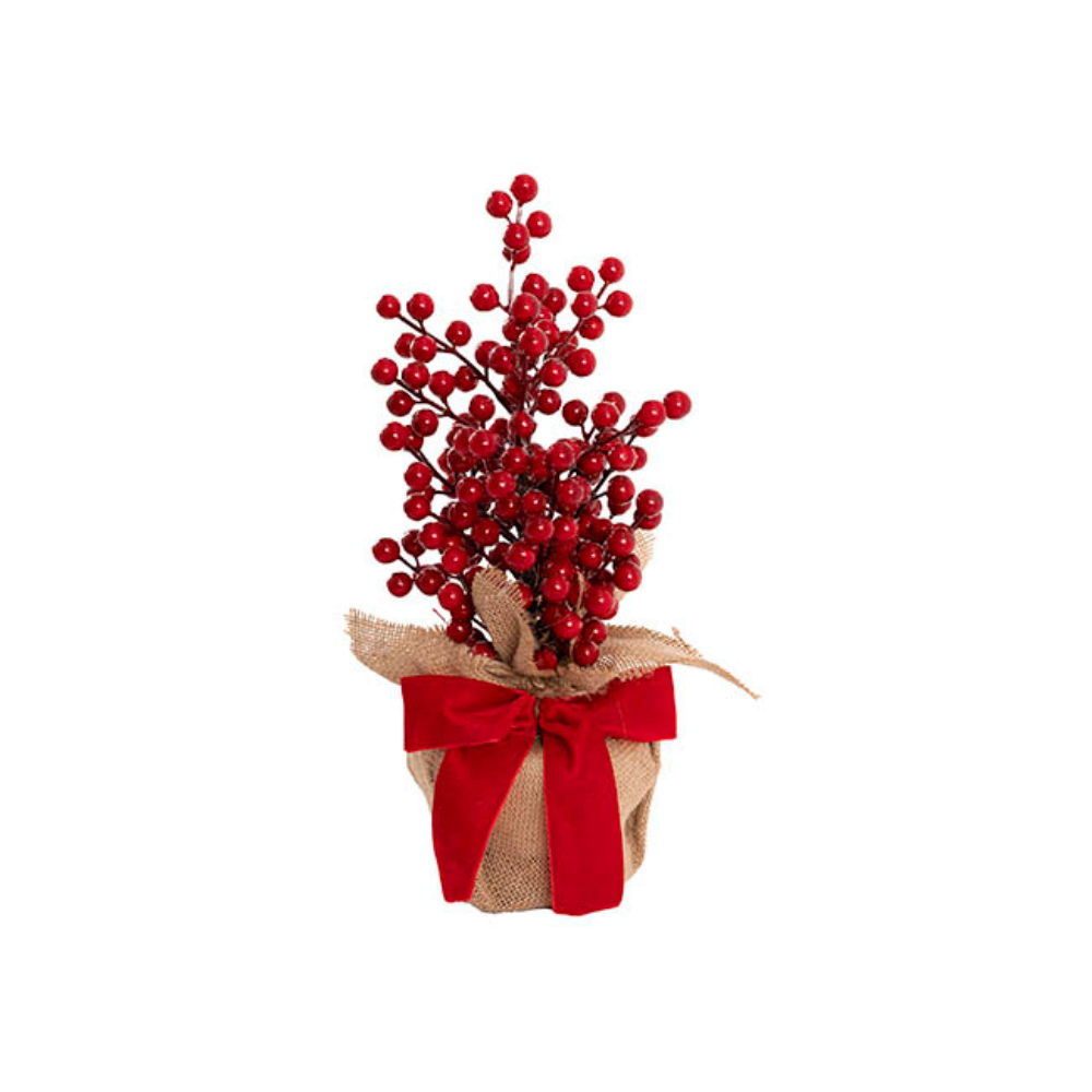 This Red Berry Table Top Tree potted in Jute Burlap offers a compact, yet effective centrepiece for your Christmas decorations. This full and lush faux tree is decorated with a red bow to match this tree's many red berries.