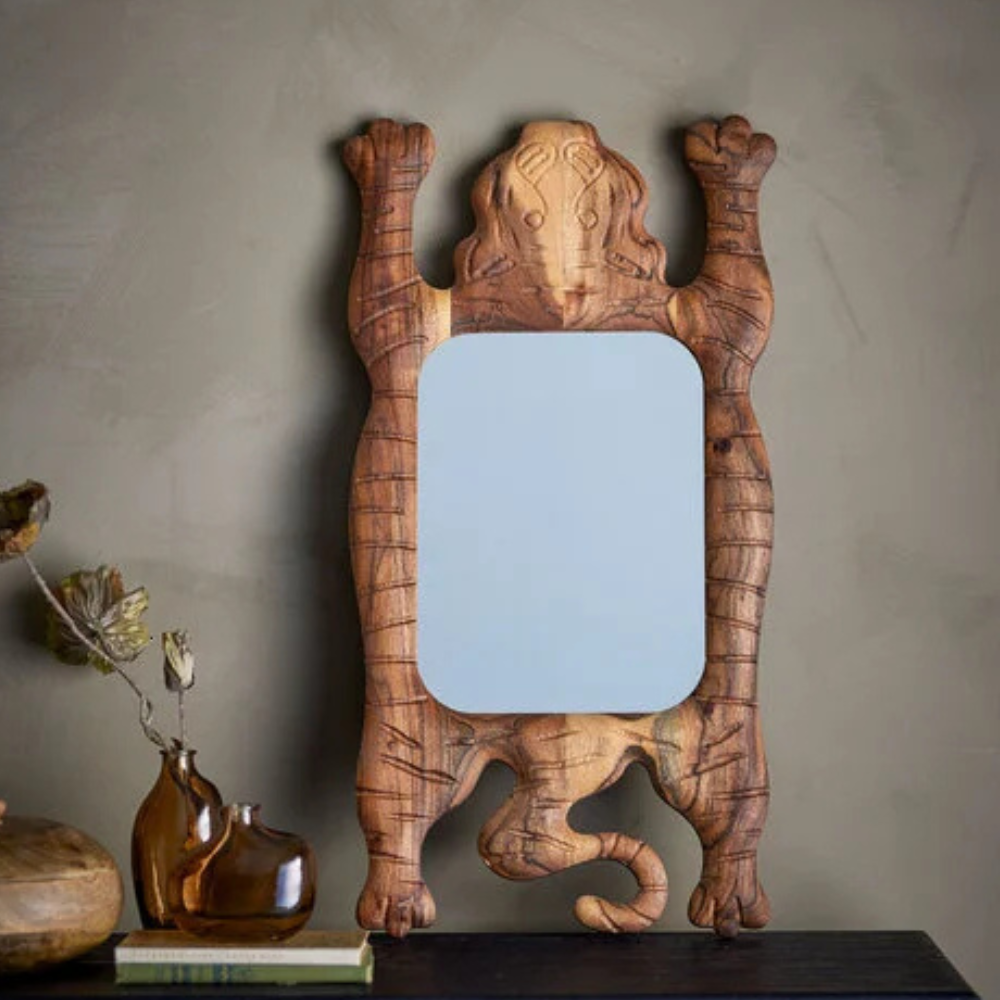 The  Marga wall mirror is a unique and decorative mirror, hand carved from mango wood and in the shape of a tiger. Use the mirror as wall decoration in the living room, hallway or bedroom to create a warm atmosphere. 34x64.5x2.5cm