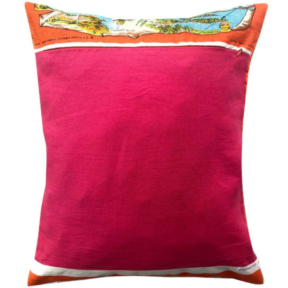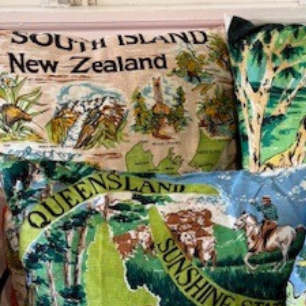 A sweet and colourful vintage linen, souvenir of the South Island of New Zealand - featuring sweet illustrations of sights, floral emblems, a great map on a scroll motif. The colours in this really make me happy - that bright orange map and border, and the rich pink on reverse make this a very lovely vintage linen - perfect for your Dunner Stunner, you home sick sister or anyone pining for the South Island.
