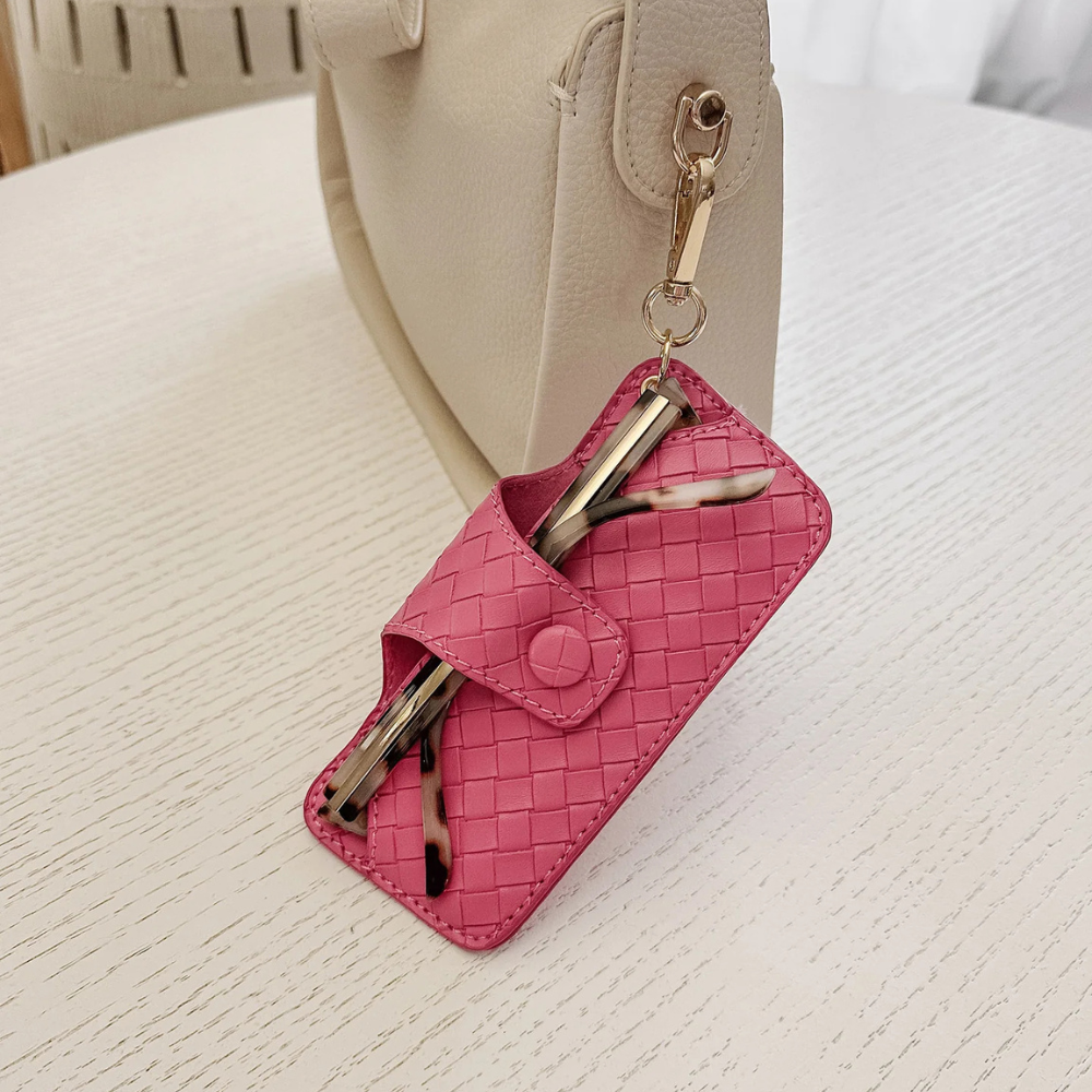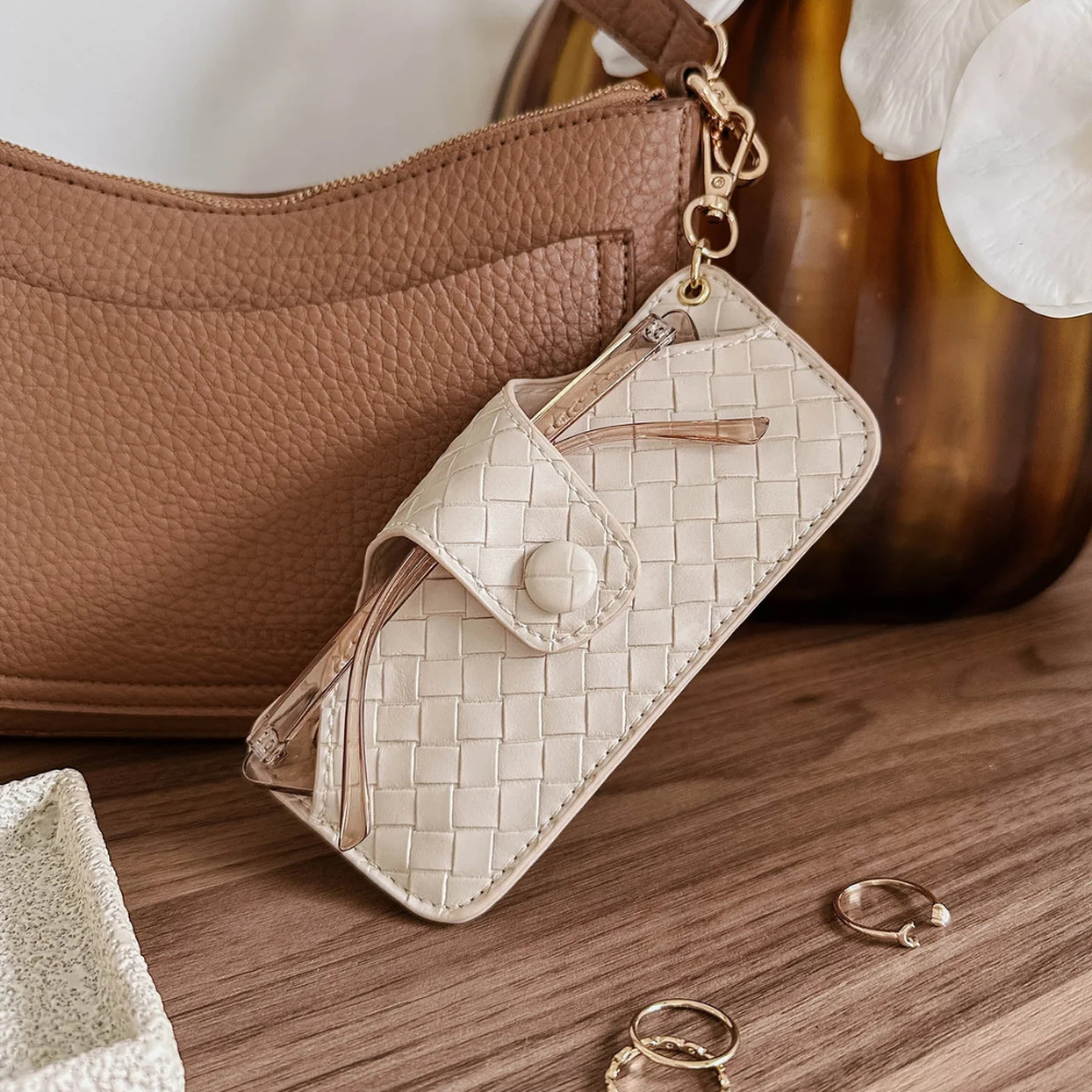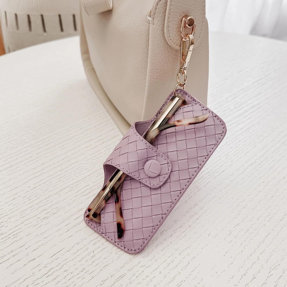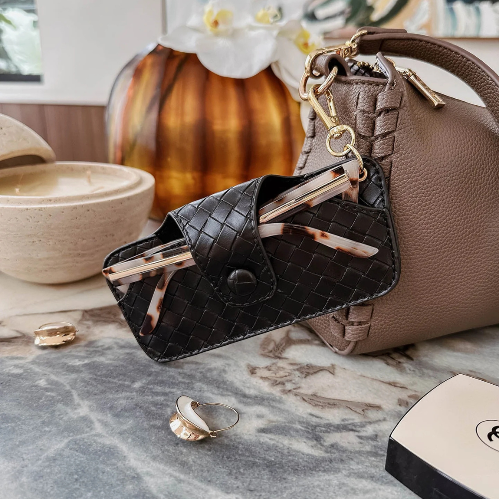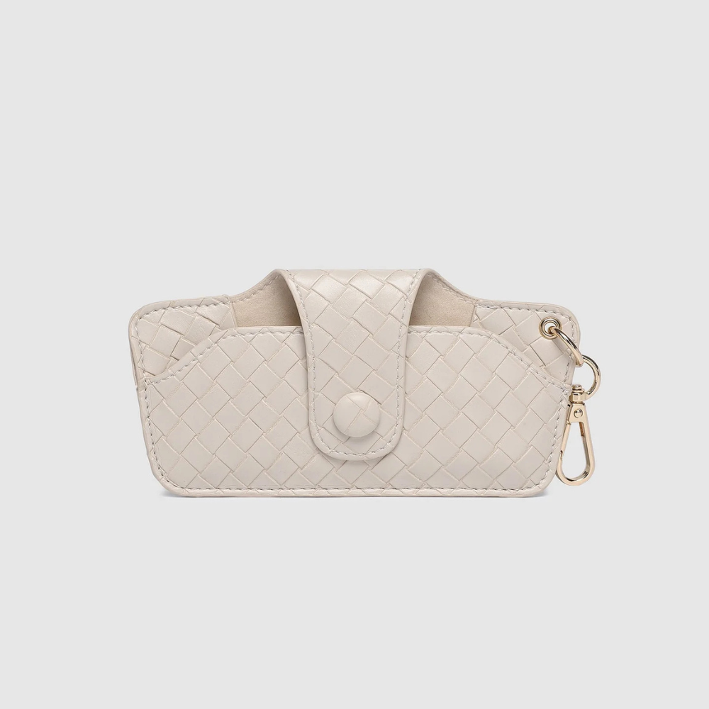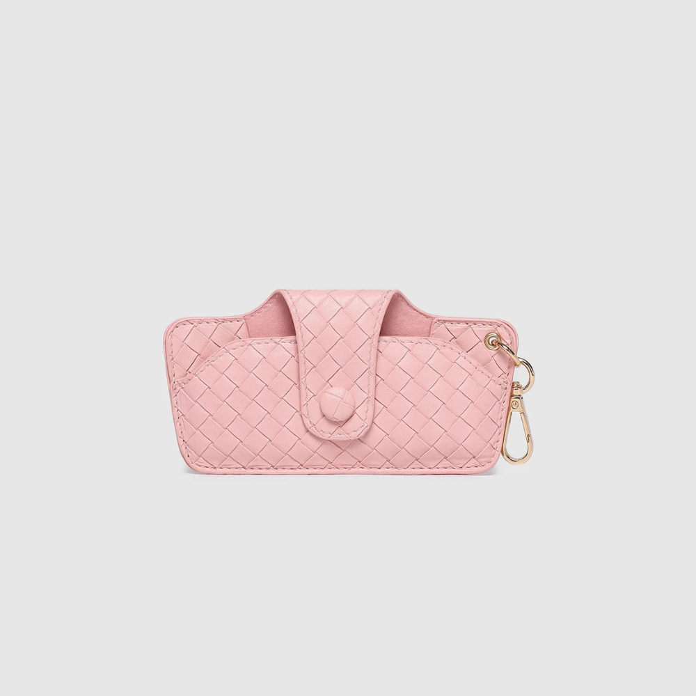 The Louenhide Skittle Woven Sunglass Case is the perfect blend of style and functionality for your everyday eyewear. For ultimate convenience, effortlessly attach to your keys or handbag with the light gold hardware keyring clasp. Without compromising on style, the exterior features a gorgeous woven vegan leather, while the interior is lined with soft suede material to keep your everyday eyewear protected. Whether it's your favourite sunglasses or your reading glasses, they will stay protected and safe with the secure metal clasp. Designed in many gorgeous shades to suit everyone's style, the Skittle Woven  Sunglass Case makes the perfect gift for any occasion.