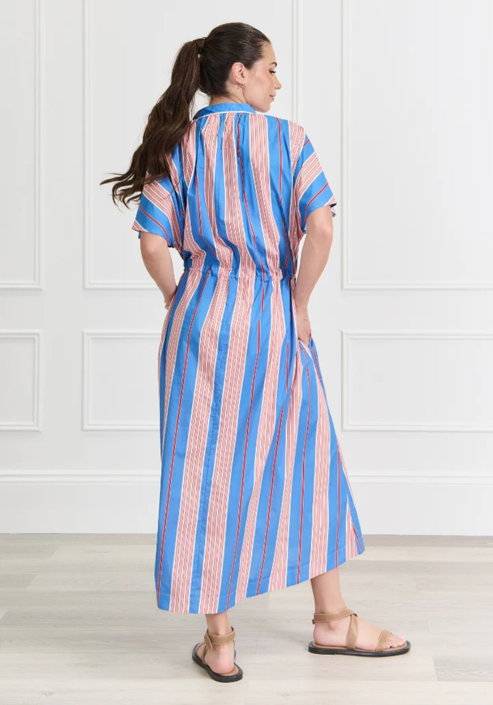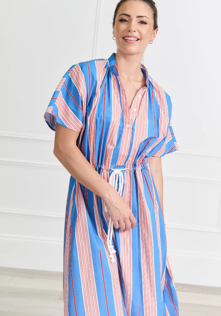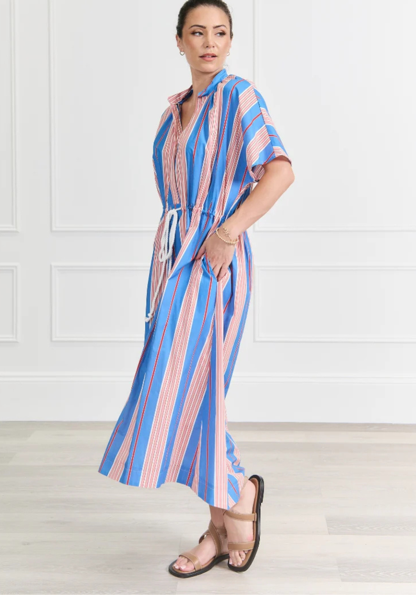 The Butterfly Dress Multi Coloured is a joyful burst of colour and movement. Featuring a vibrant butterfly inspired print with soft pink and blue stripe accents, this floaty dress is crafted from 100% cotton for breathable comfort all day long. Its soft silhouette and flattering fit make it the perfect dress for summer outings, beach holidays, garden parties or long lunches with friends.