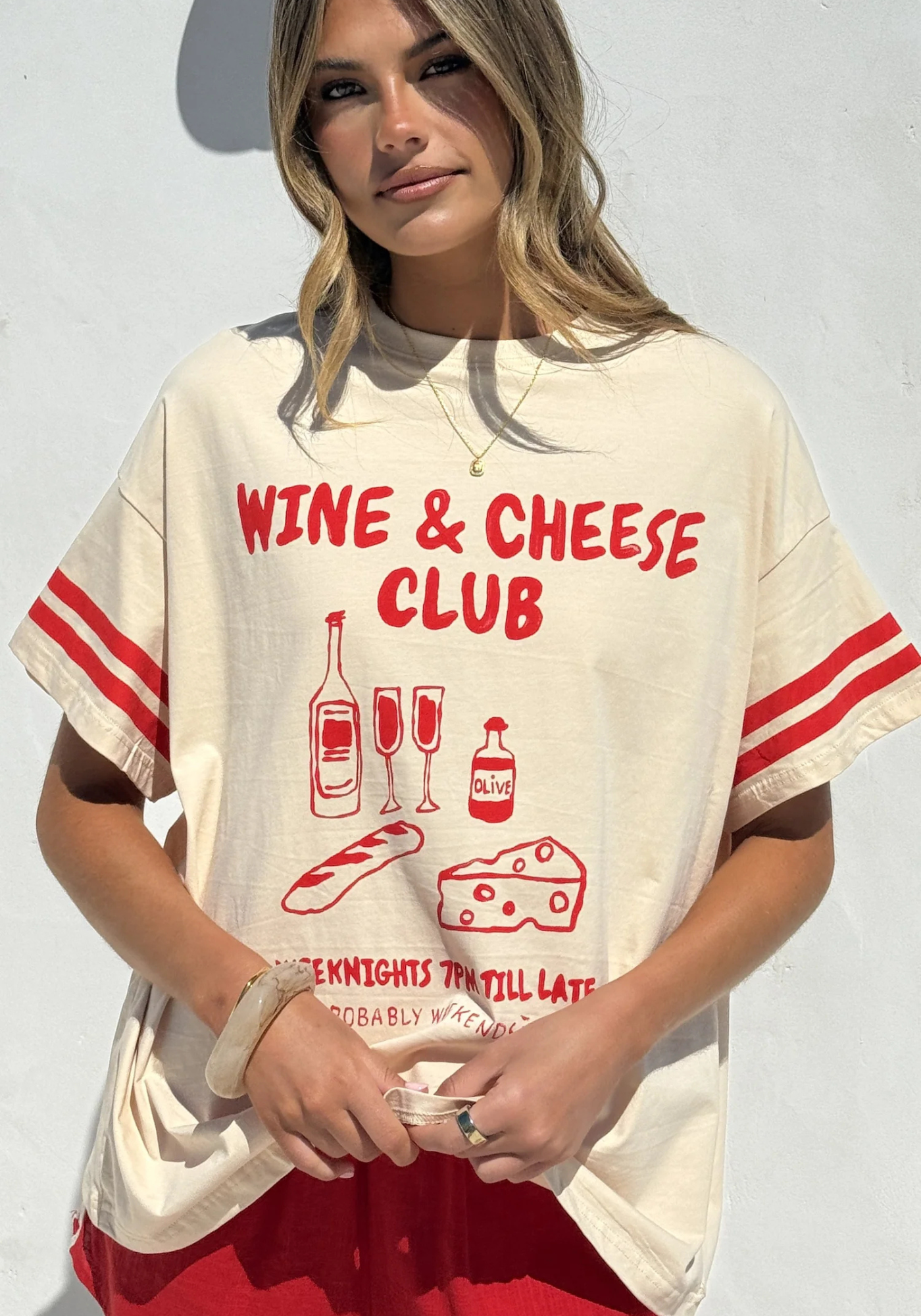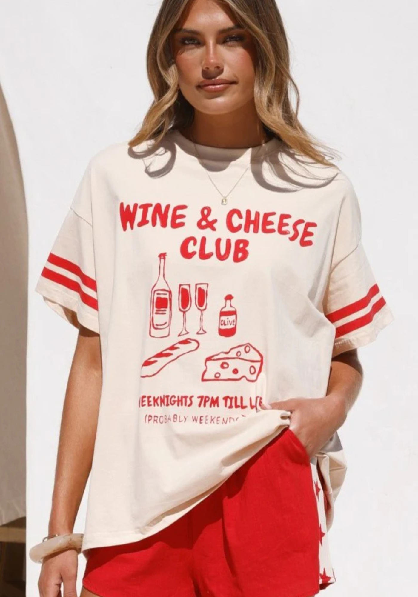 Elevate your casual wardrobe with the Wine and Cheese Club T-shirt and Shorts Set in red and beige. The crew neck top features a relaxed fit, crafted from 100% cotton, offering breathable comfort. The high-waisted shorts boast an elasticated waistband and side pockets, fully lined for a refined finish. Both pieces combine effortless style with premium natural fabrics for a laid-back yet polished look.