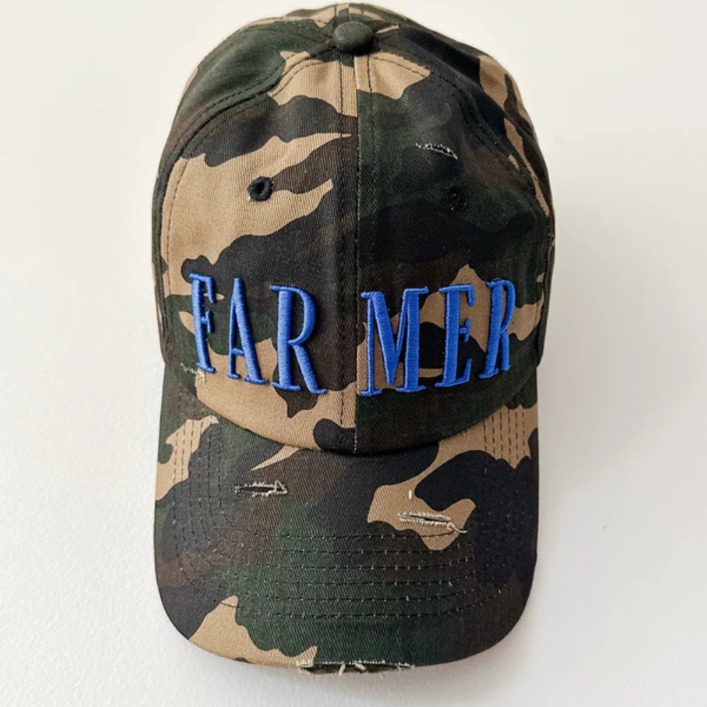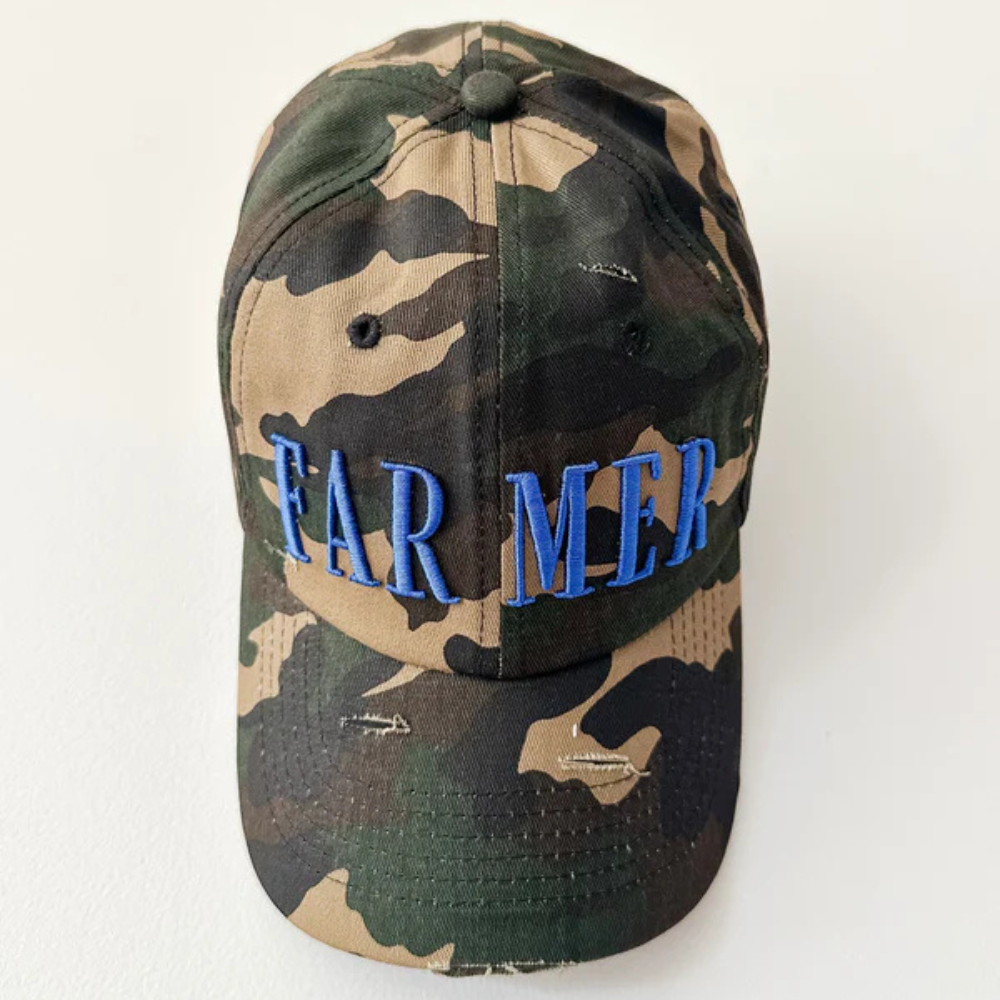 Embroidered 'FAR MER' on distressed camo look cap with adjustable brass look strap.