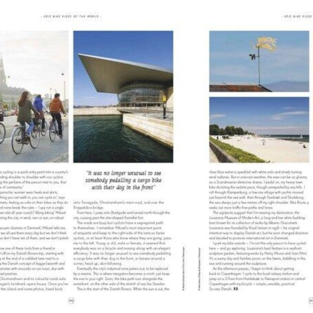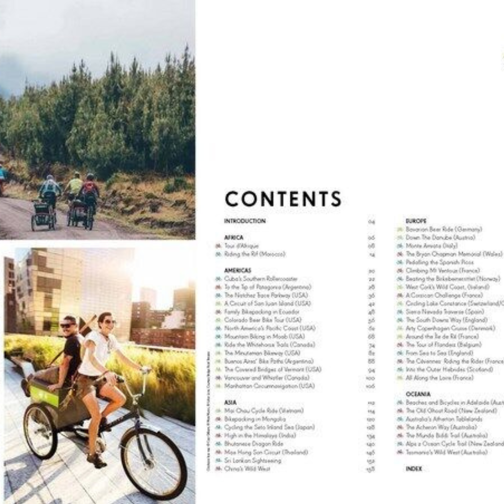 The book is organised by continent. In the Americas we join a family bikepacking trip in Ecuador; we pedal the Natchez Trace Parkway and stop at legendary music spots; we ride the Pacific Coast Highway in Oregon and California; go mountain biking in Moab and Canada; and explore the cities of Buenos Aires and New York by bicycle.