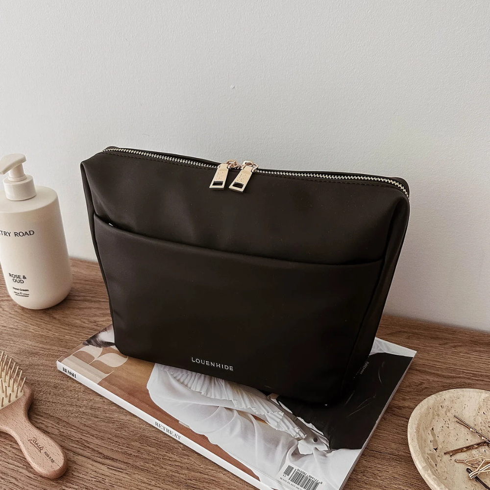 The Vanessa Black Cosmetic Bag is a travel-ready essential designed to bring ease and elegance to your beauty routine. Crafted with a sleek silhouette and smooth zip-around opening, Vanessa Black lays flat to reveal your products at a single glance- no digging, no fuss. Thoughtfully designed for both daily use and weekend escapes, her wide-opening interior offers seamless organisation. Compact enough to slip into your travel tote or suitcase, Vanessa Black travels light without leaving the essentials behind. Perfect for those who like their beauty routine as organised as their itinerary.